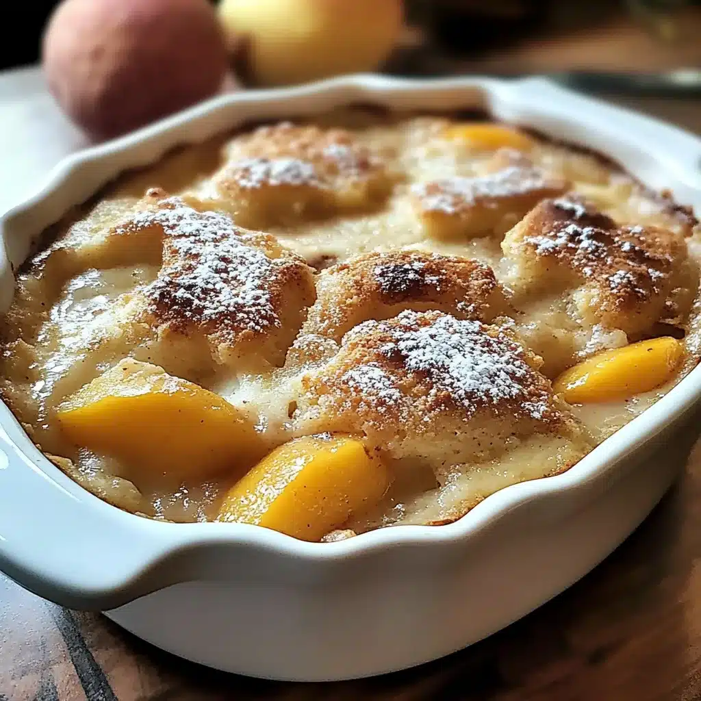 4. Combine: Pour the batter into a greased baking dish. Do not stir. Gently layer the peach mixture over the top of the batter.