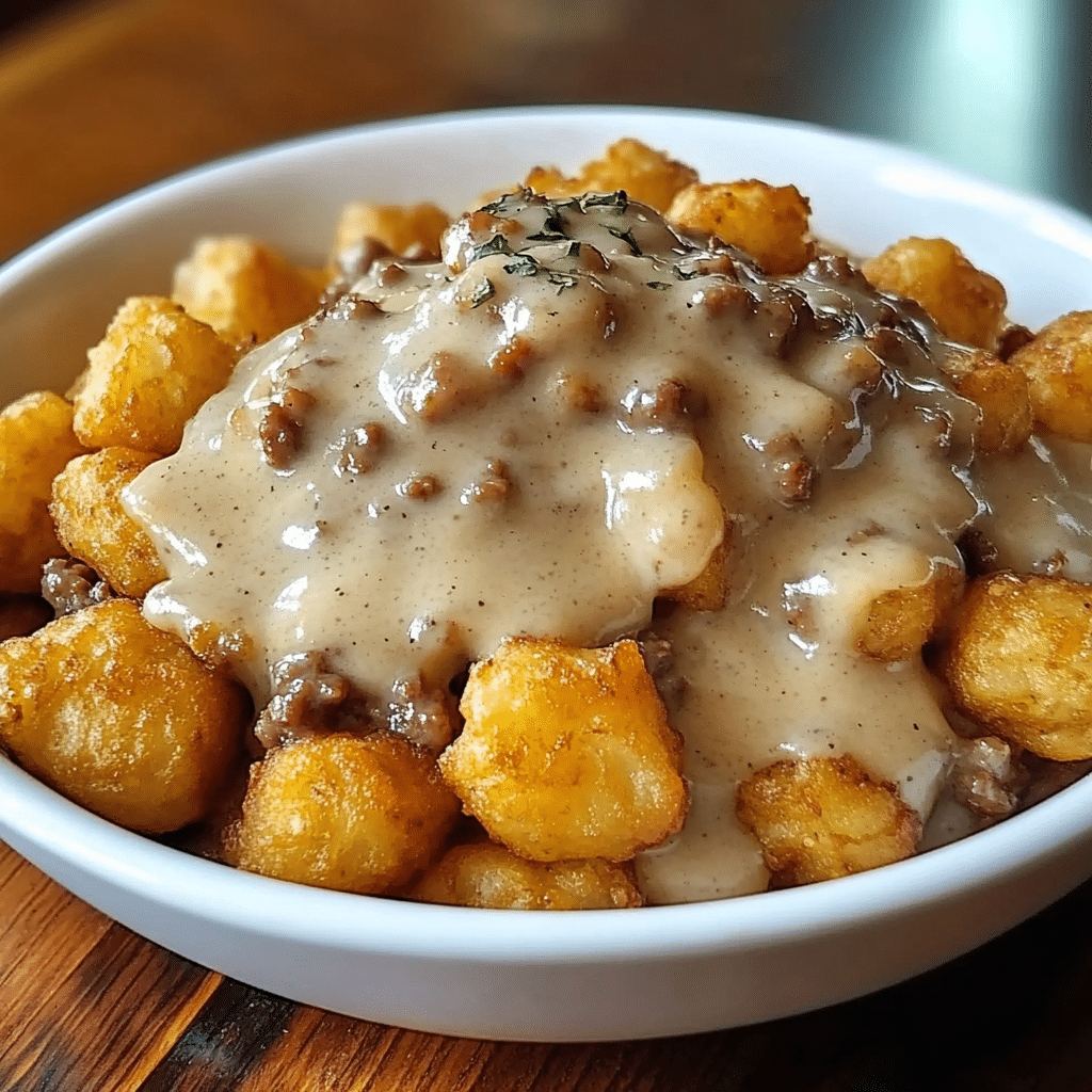 - Add the Sausage Gravy: Spoon the rich sausage gravy over the tater tots, making sure each bowl gets plenty of the creamy gravy.