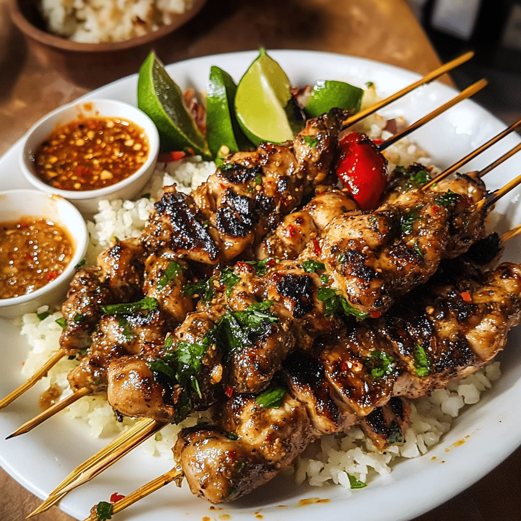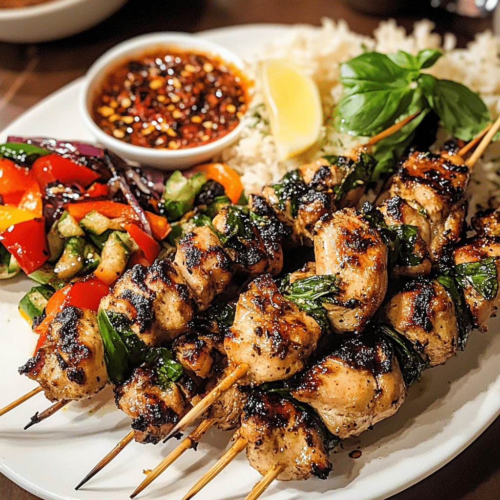 Thai Spicy Basil Chicken Skewers are a flavorful, vibrant, and easy-to-make dish that’s perfect for any occasion. With their tender, juicy chicken marinated in a blend of zesty lime, fresh basil, and fiery chilies, they offer a tantalizing combination of spicy and savory flavors that will please any palate. Whether you’re grilling them for a BBQ, serving them as appetizers, or enjoying them with rice and vegetables, these skewers are a crowd-pleaser. Plus, they’re customizable to your spice level, making them a versatile dish for all tastes. Enjoy!